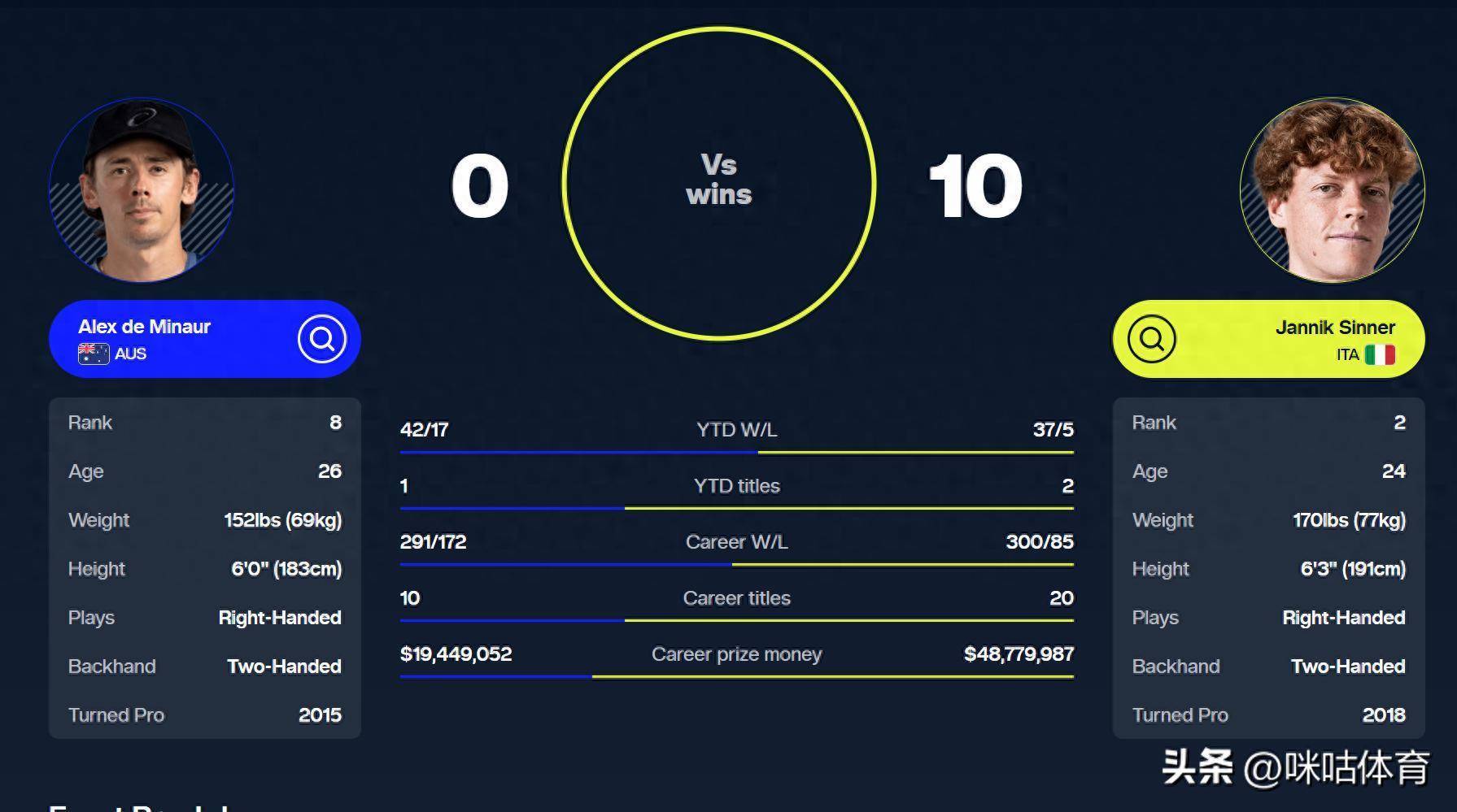 中网丨预定男单决赛?辛纳与德米纳尔10次交手保抓全胜!